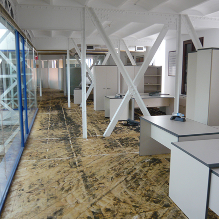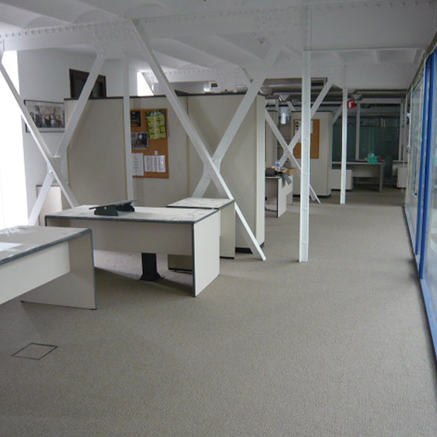 Instalación de nueva moqueta en losetas en la sexta planta mediante moqueta Interface Floor de gran resistencia al transito, con propiedades de absorción acústica y con un tratamiento ignífugo, previamente pulido de la base de madera en mal estado.