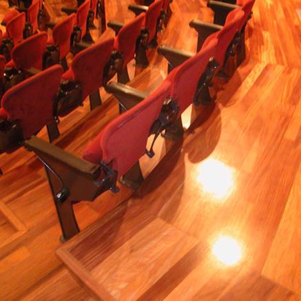 - Nou paviment de tarima de fusta d’elondo clavada sobre rastells a la zona baixa i polit i envernissat amb vernís ignífug l’existent de les grades.